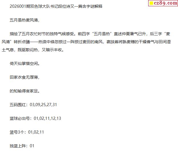 > 26年福彩双色球001期 大队书记段位诗另一篇